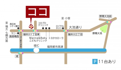・大橋、野間方面より 大池通りを西方面へ直進。「樋井川3丁目交差点」より400M先右側。