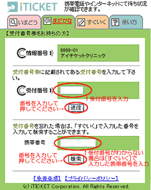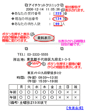 ※受付番号が現在の呼び出し番号より前であれば、待ち人数・待ち時間は0で表示されます。